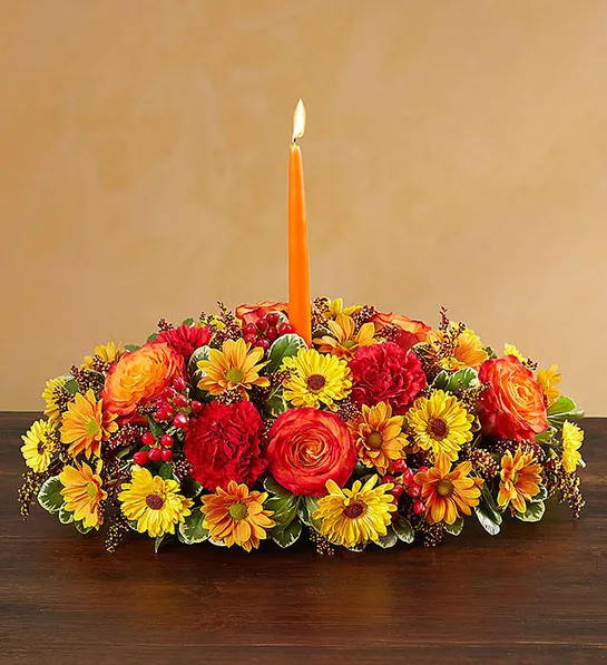 Send your warmest wishes to the people you love with our colorful autumn centerpiece. This traditional table arrangement is designed with radiant blooms and finished off with an orange taper candle to cast a cozy glow over seasonal gatherings.