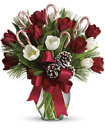 Nothing’s sweeter than Christmas tulips – except maybe Christmas tulips with candy canes! This jolly arrangement is about as fun and festive as they come, mixing fresh red and white tulips with fragrant Douglas fir and white pine. Say Merry Christmas to a teacher, friend or loved one far away.