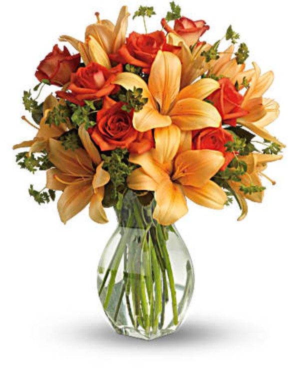 Ignite their heart with this inspirational gift of warm orange roses and lilies. As wondrous as a summer sunset – but quite a bit more fragrant! – it’s a versatile choice for men and women alike.