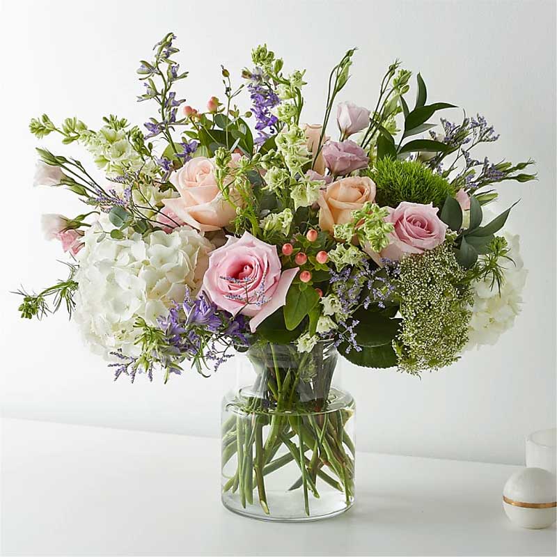 With its beautiful blend of roses, larkspurs, hypericum berries, Queen Anne’s Lace, trick dianthus, and Limonium, this artful arrangement could have inspired a Monet masterpiece.