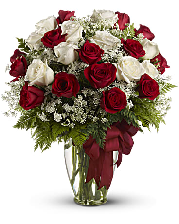 • Red and white roses – accented with Queen Anne’s lace and more – are delivered in a glass vase accented with a red satin ribbon.