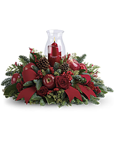 A magnificent arrangement for any holiday event. As a beautiful Christmas centerpiece or mantle decoration, this unique arrangement mixes shiny red apples with festive greens around the base of a glowing pillar candle. The clear hurricane adds a traditional touch.