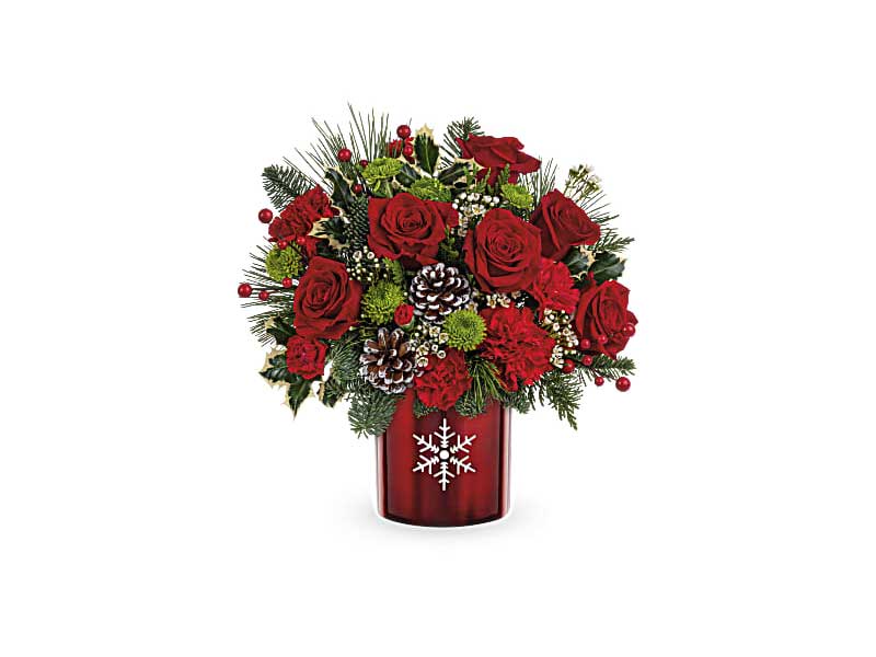 This Christmas flower arrangement includes red carnations, miniature red carnations, green button spray chrysanthemums, white waxflower, cedar, noble fir, white pine and variegated holly. Delivered in Teleflora’s Stunning Snowflake Cylinder.