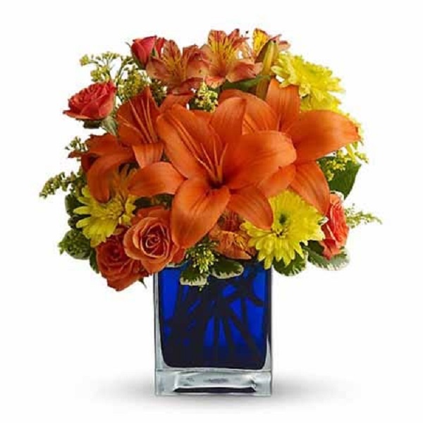 Flower power rises several degrees in this brilliant array of hot summer flowers in a cool blue contemporary glass cube vase. Send this gift of indoor sunshine to someone close to you.