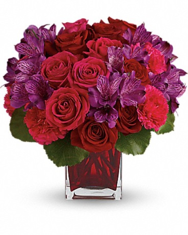 This lush arrangement features red roses, dark pink roses, purple alstroemeria, hot pink carnations and galax leaves.