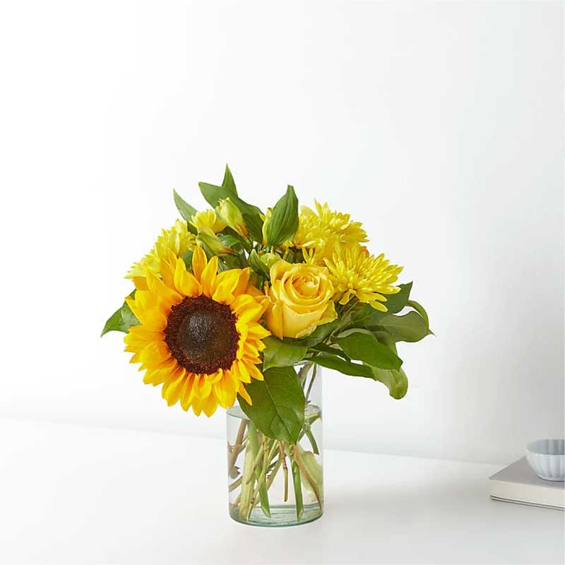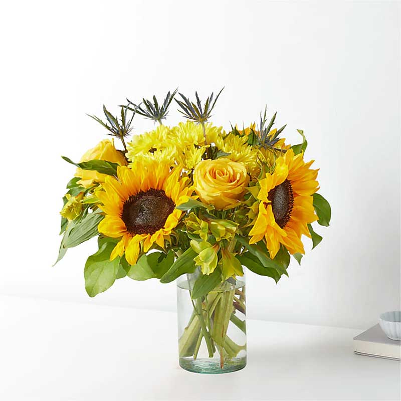 Feel like someone’s cheering you on with bright sunflowers, roses, and alstroemeria.