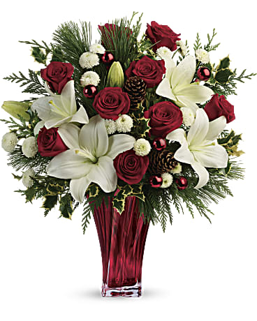 Red roses, white asiatic lilies and white button chrysanthemums are accented with fresh flat cedar, variegated holly, white pine, pinecones and red ornament balls.